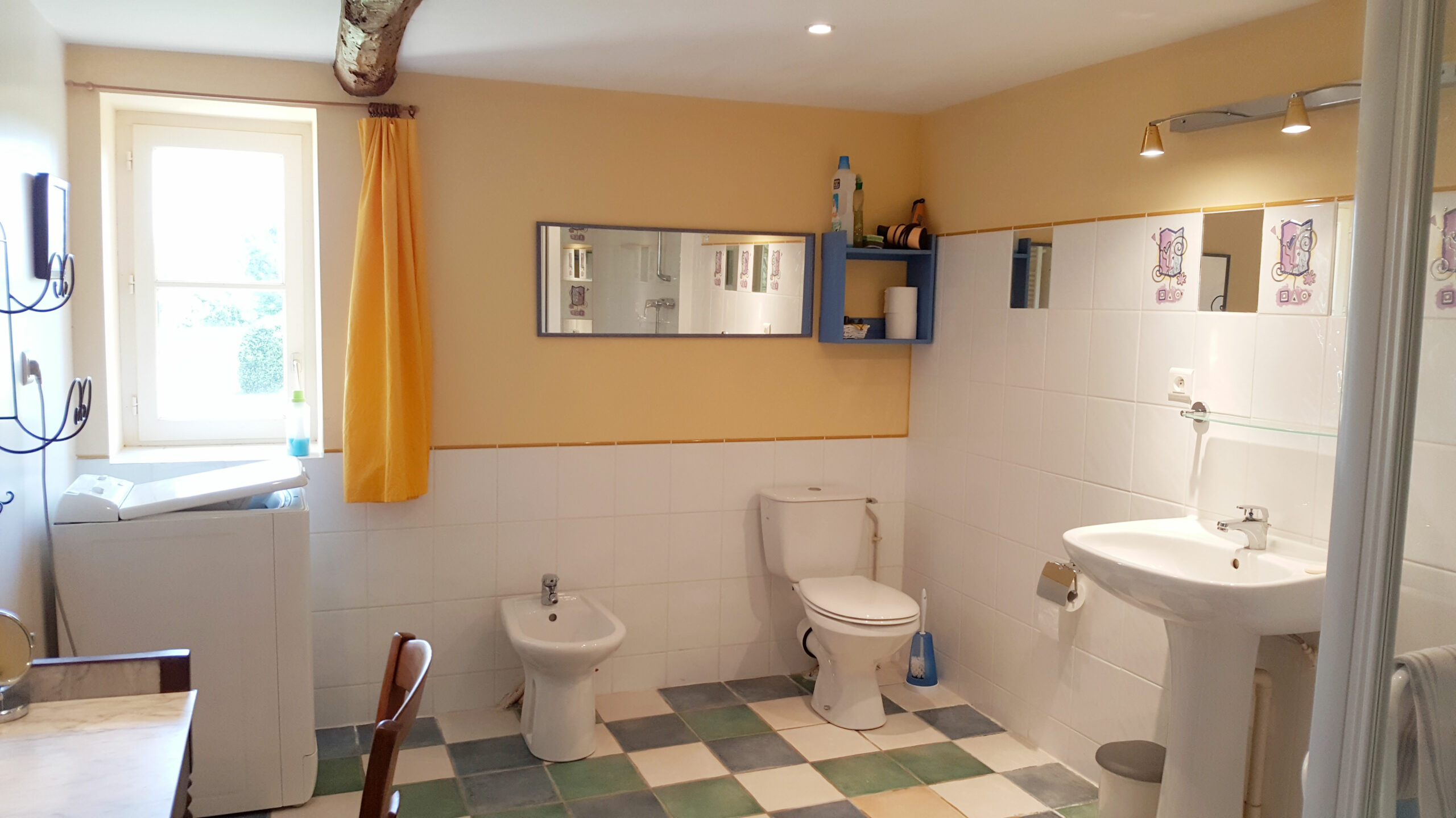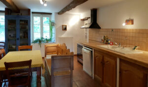 Au Rez-de-Chaussée : entrée, grande cuisine toute équipée (gazinière, frigo, congélateur, lave-vaisselle, micro-ondes, …), poêle à bois, salle de bains (douche, WC, bidet, lave-linge)