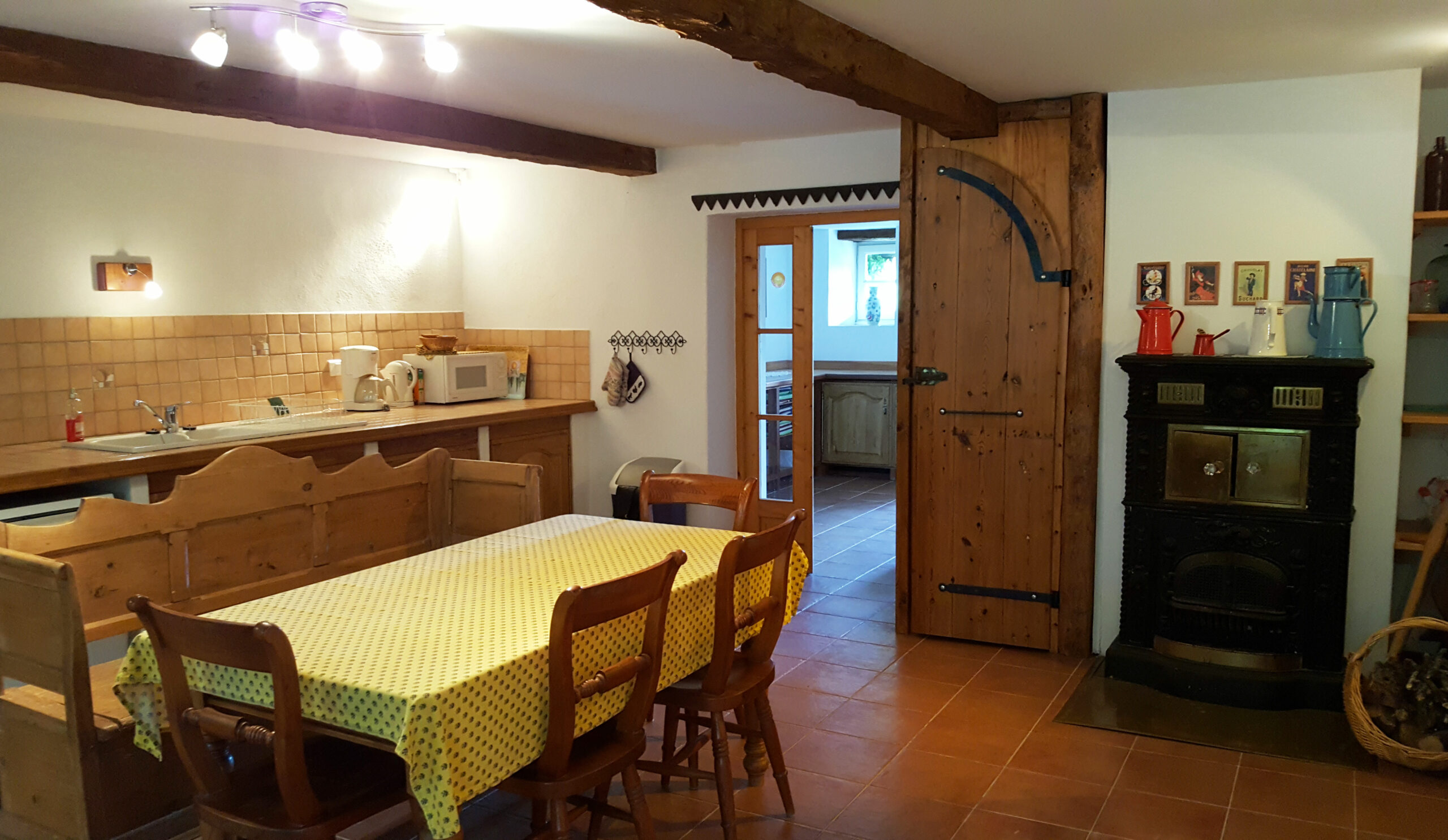 L’ancienne ferme est entièrement restaurée et équipée, parc & piscine, barbecue. Grande cuisine avec poêle à bois, grand salon avec TV/DVD, 2 chambres à coucher (2 lits 160 cm, lit bébé, lit 1 personne). Les lits sont faits à l’arrivée, le linge de maison est fourni.